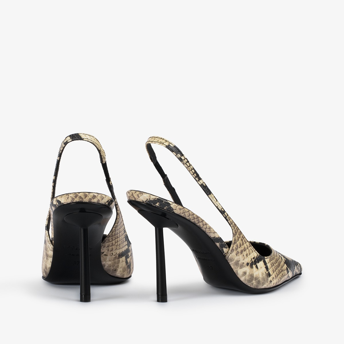 The Bella slingback by Le Silla, crafted in python-printed leather, is a true style icon that blends contemporary design with a distinctive edge. Expertly handcrafted in Italy, this shoe features an 80 mm stiletto heel that elegantly elongates the figure, delivering flawless sophistication with every step. The python print, in natural and contrasting tones, offers bold character and an intriguing texture, ideal for those who want to stand out with an accessory of exclusive and exotic allure. The sleek silhouette and pointed-toe design highlight the curve of the foot, while the back strap ensures comfort and stability, making the Bella slingback the perfect ally for facing the day with poise and confidence. A Made in Italy masterpiece, designed for those who appreciate luxury and wear it with personality.