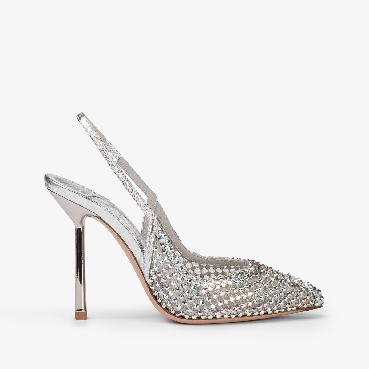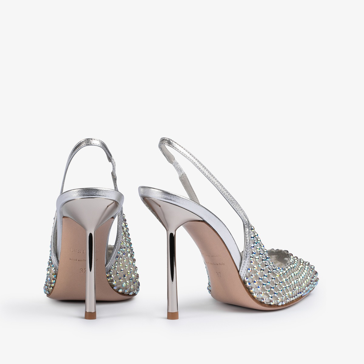The Gilda slingback by Le Silla embodies pure elegance with its crystal-embellished upper and laminated leather finishes. Its sleek silhouette, 100 mm stiletto heel, and open toe accentuate a sophisticated femininity, perfect for those who love to stand out with charm and radiance. Expertly handcrafted in Italy, it is the ultimate choice to shine with class on any occasion.
