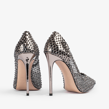 Gilda pumps, the ultimate jewel shoes, are handcrafted in Italy with meticulous attention to detail. This model features pewter-colored metallic inserts that are bold and magnetic, along with the traditional netting that creates a seductive see-through effect. The netting is adorned with crystals matching the upper, adding a touch of sparkling luxury. The 120 mm stiletto heel and the pointed toe enhance the sophistication of this shoe, making it perfect for those seeking refined and unique elegance.
